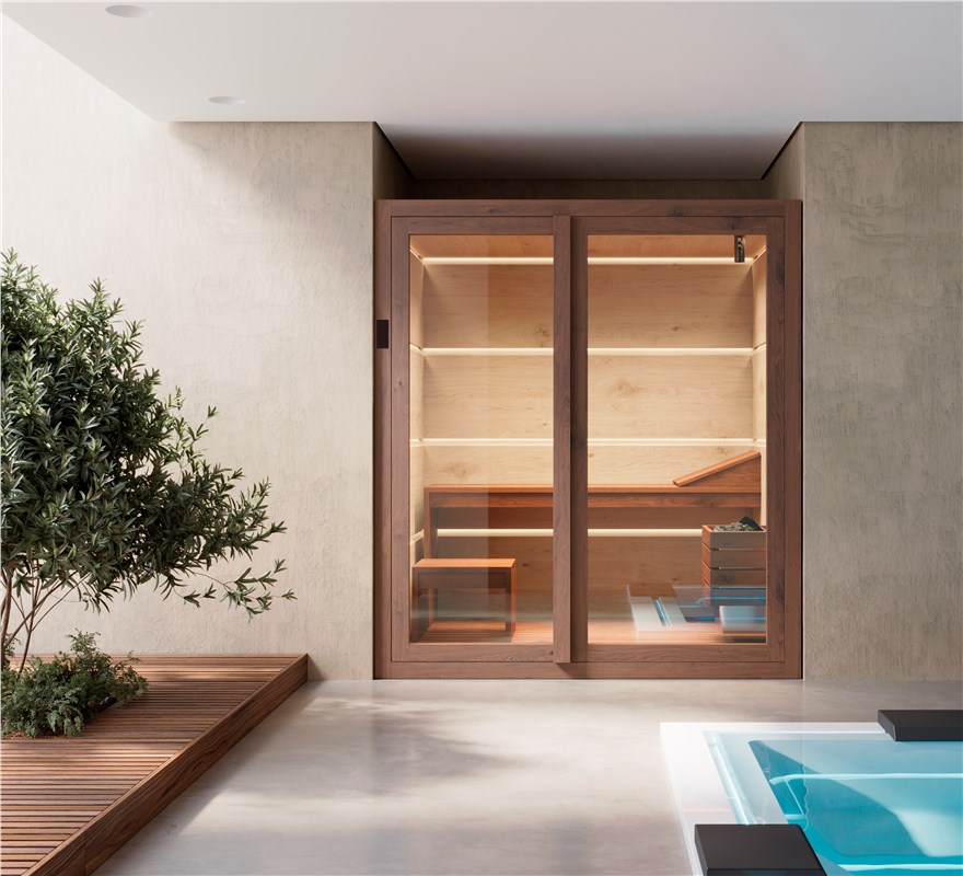 Pour répondre à une large gamme de besoins, le sauna Aura est disponible en deux versions : la première avec une vitre frontale, la seconde avec vitre frontale et latérale. En ce qui concerne les dimensions, vous pouvez choisir la taille qui convient le mieux à vos espaces : 160x120xH216 cm, 180x120xH216 cm, 180x150xH216 cm, 200x150xH216 cm et 200x200xH216 cm. De plus, il peut être installé dans une niche, contre un mur, au centre de la pièce ou dans un coin (gauche ou droit).
